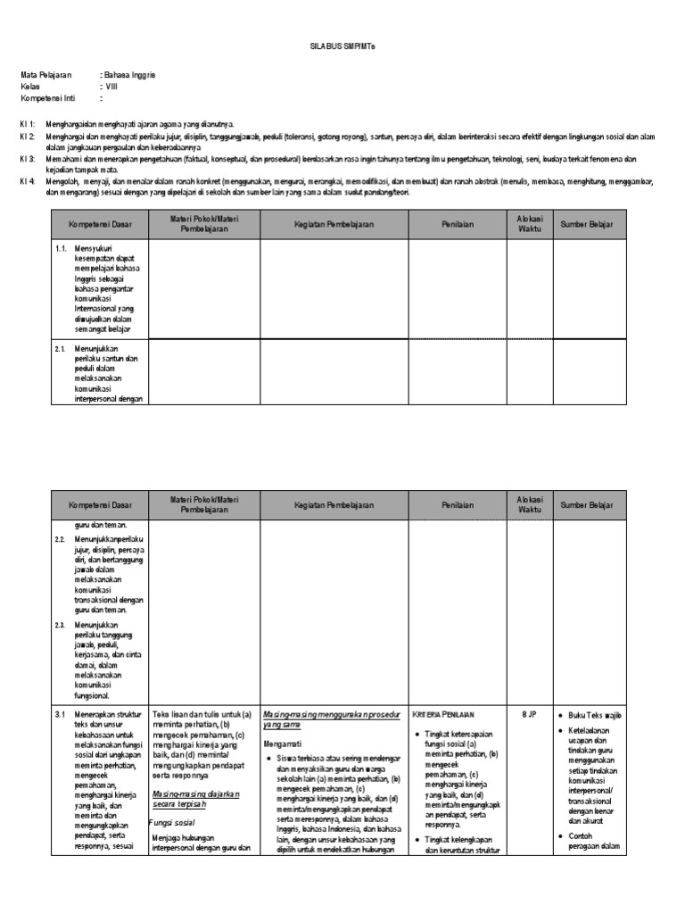 Silabus Bahasa Inggris K13 Kelas 8 Lengkap Downlad from www.kursiguru.com We did not find results for: Maybe you would like to learn more about one of these? Silabus bahasa inggris kelas 8 k13. Check spelling or type a new query.